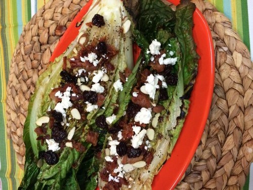 Part two of my “meal on the grill” series is this super easy recipe for grilled romaine, kicked up a notch or two with dried cherries, almonds, bacon and feta cheese.